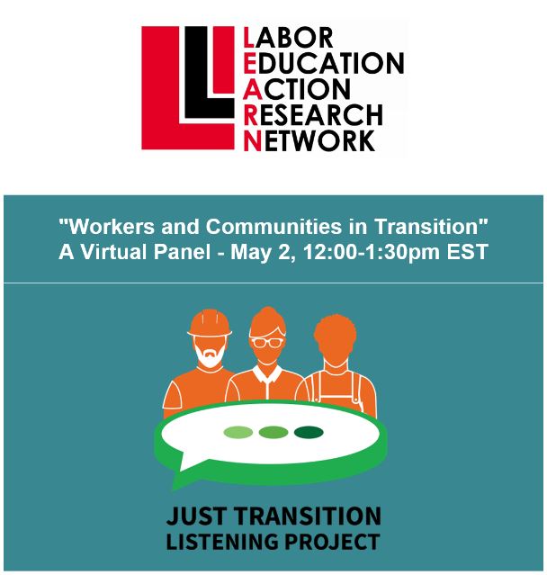 Logo for Labor Education Action Research Network is a red rectangle with a black “L-shaped” line running through it. Image for Just Transitions Listening Projcet is on an aqua blue background with three orange people seated around a green and white table made to look like a quotation bubble.